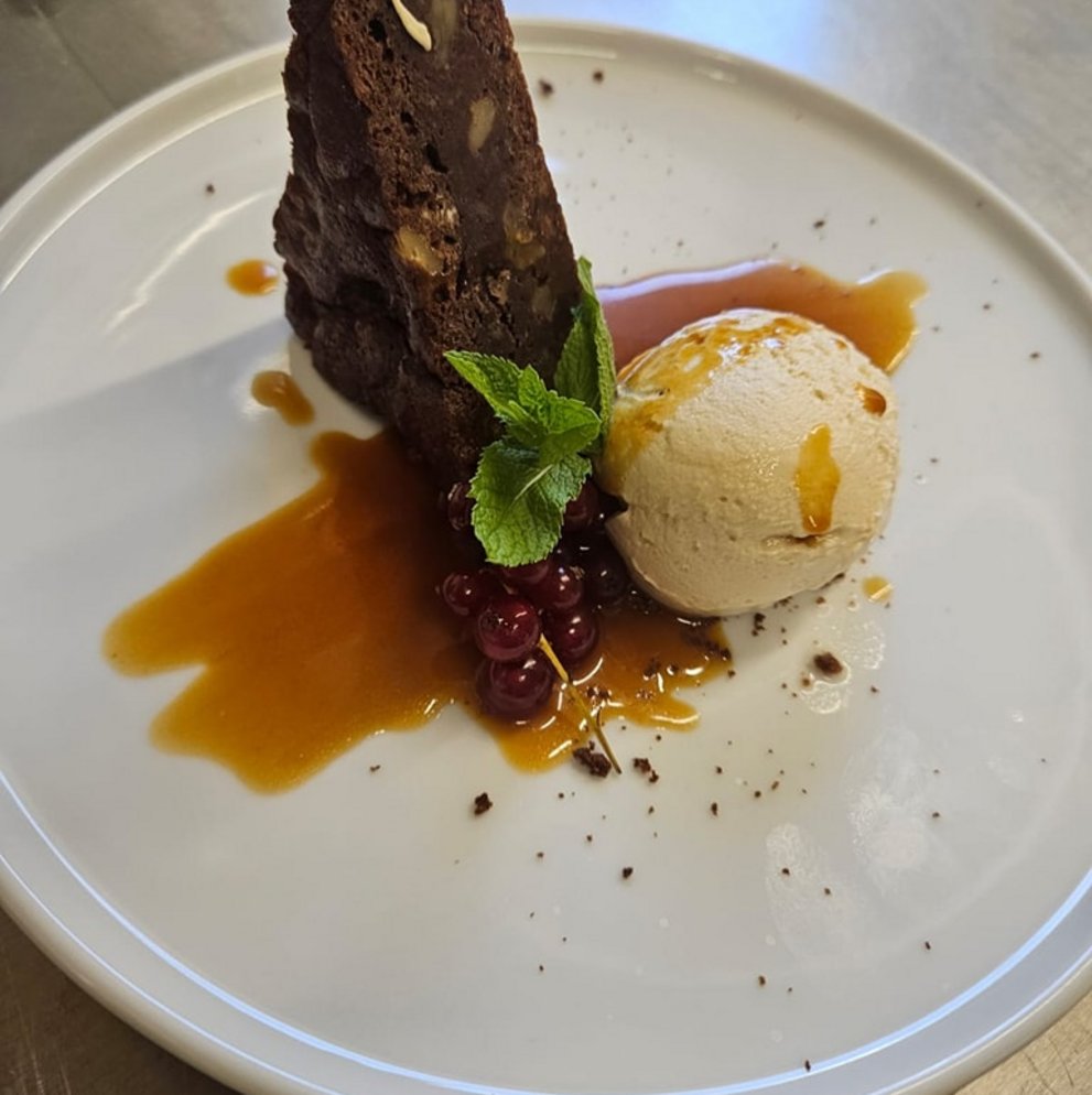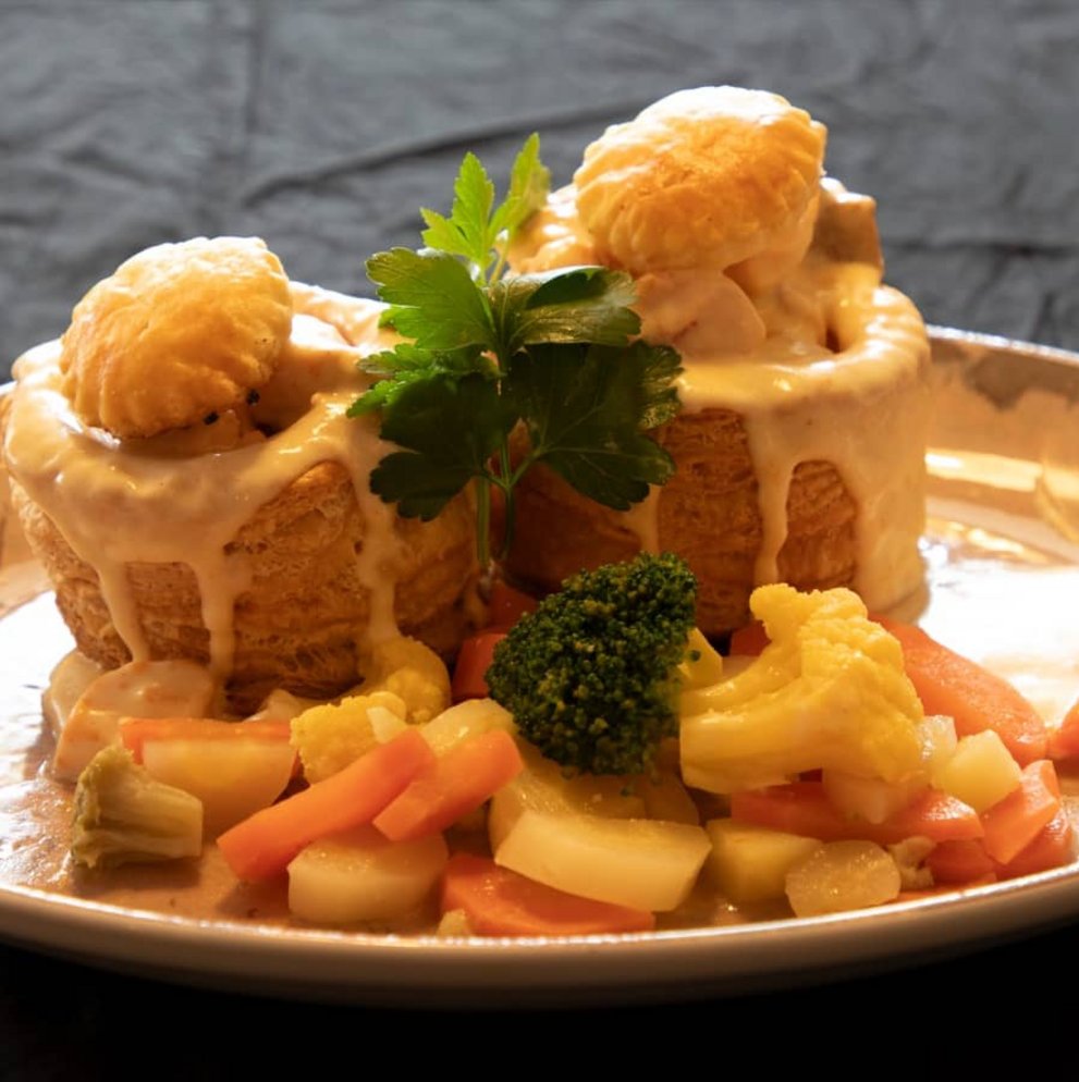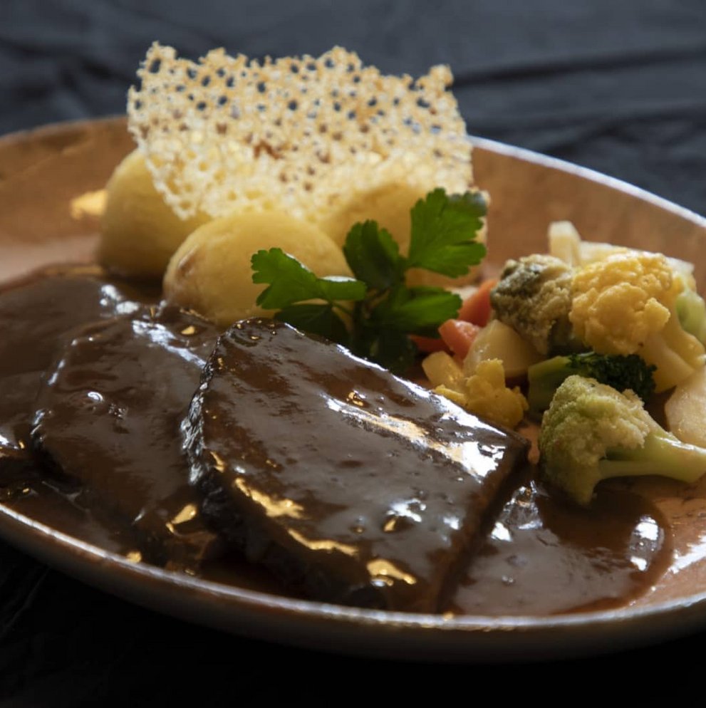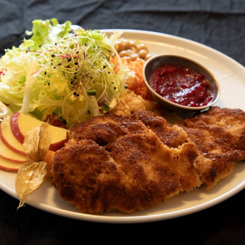 Mit hausgemachten Pommes Frites, Saisongemüse und gerührten Preiselbeeren