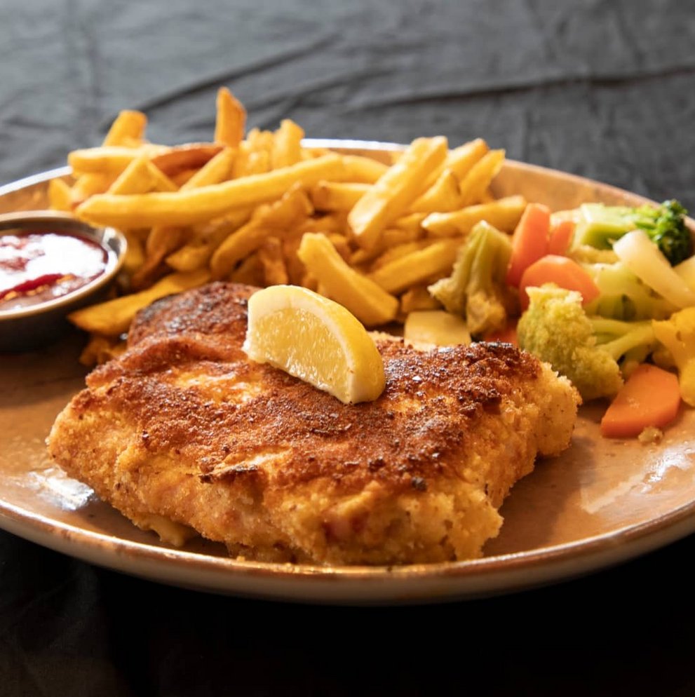 Mit hausgemachten Pommes Frites und Saisongemüse